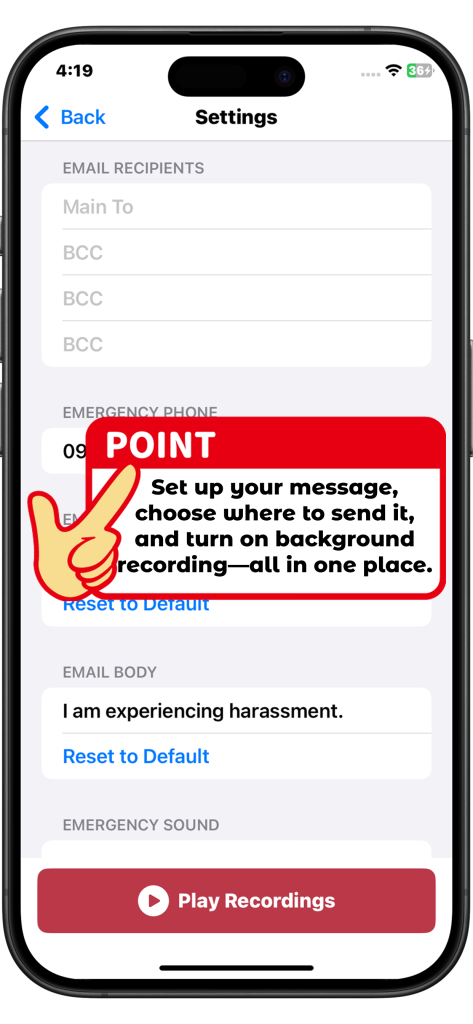 - Tap the Emergency Sound button to trigger a loud warning tone immediately